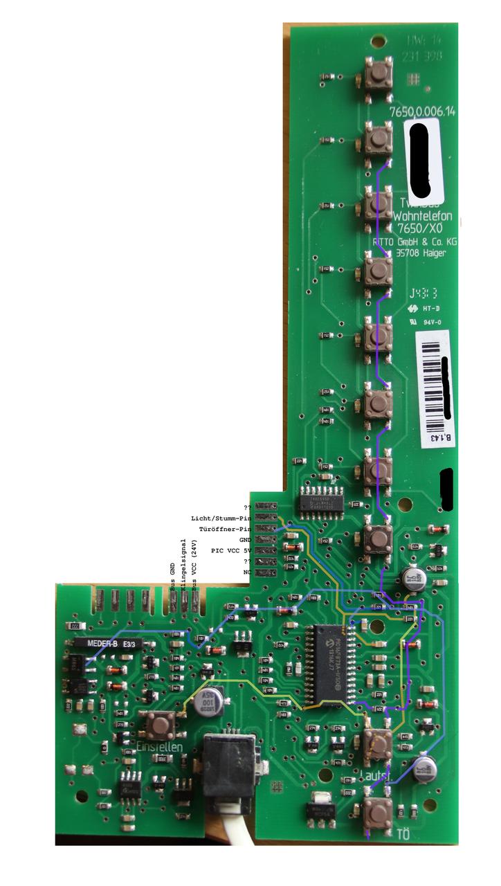 Komplizierter ist das Schalten des Türöffners und der Stumm-Taste. Während beim 7630 nur ein Pin der sieben-poligen Fahnenleiste auf GND gezogen werden muss, kommt beim 7650 mutmaßlich multiplexing mit zwei anderen Pins des PIC Mikrokontrollers zum Einsatz. Das Durchmessen der Platine ergab, dass von den Buttons jeweils zwei Kontakte am gleichen Pin des PIC landen (lila) und die zwei anderen je an einer der Fahnen (blau/gelb). Leider kann man sich daher nicht einfach nur an die Fahnen klemmen. Da die lila Verbindung aber ziemlich am Ende des PCB endet, kann auch hier ein 3-poliger RAST 2.5 Stecker angeklemmt werden. Für die andere Seite bietet sich ein 4-poliger RAST 2.5 Stecker mit Führungsschiene an, dadurch lässt er sich leicht platzieren. Ich nutze TE 4-1534796-4.Jetzt kann durch Schalten der in meiner Zeichnung blau bzw gelb Kontakte markierten Kontakte gegen den "lila Anschluss" am Taster der jeweilige Tastendruck simuliert werden.