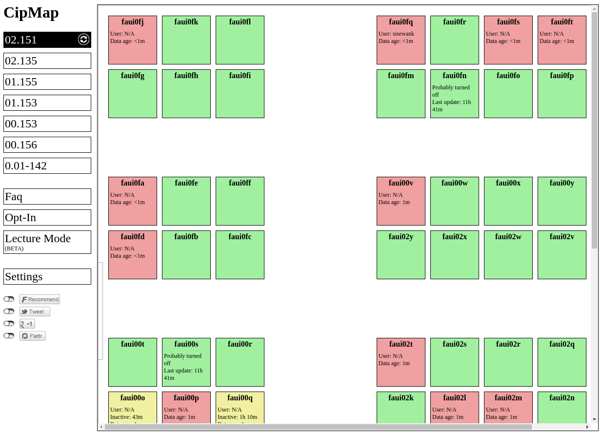 Lohnt es sich, in den Computerraum im zweiten Stock zu gehen? Wie viel ist gerade los? Diese Fragen beantwortet cipmap.t-animal.de zumindest für die FAU. Leider gibt es keinen Demo-Modus und die Daten selbst sind nur aus dem Uni-Netz verfügbar (dementsprechend gibt es Fehlermeldungen von außerhalb der Uni).