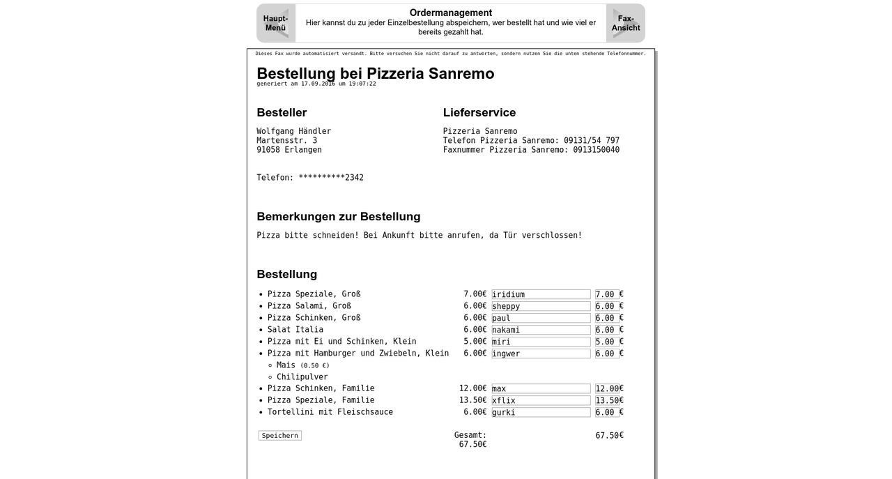 Als 2013 die Pizza-Lieferwebsiten ankündigten, ihre Provision zu erhöhen und ich erfuhr, dass von einer Bestellung etwa 15% an pizza.de gehen, war bei mir das Maß voll. In der Fachschaft der Uni haben wir zu dieser Zeit monatlich für mehrer hundert Euro Pizza bestellt und die Kohle wollte ich bei den Pizzabäckern wissen und nicht in einem erpresserischen System von Lieferwebsites versickern lassen. Telefonisch bestellen ist aber aufgrund häufig gebrochenem Deutsch bei den Pizzerien nur schwer möglich. Die Lösung war, das (ziemlich obfuskierte) javascript eines Anbieters zu reversen und eigenen Code zu injecten. Fortan war es möglich, eine Bestellung online zusammen zu stellen, aufzuschreiben, wer welche Pizza wollte, dann einen Knopf zu drücken und die Bestellung per Fax über meine Seite abzuwickeln - kostenlos für alle Beteiligten natürlich.Ende 2016 hat der Anbieter leider seine Website umgestaltet und weil der Pizza-Konsum in der Zwischenzeit deutlich zurückgegangen war und viele Erlanger Pizzerien inzwischen eigene Websites hatten, hab ich mir nicht nochmal den Aufwand gemacht, das Projekt wiederzubeleben.